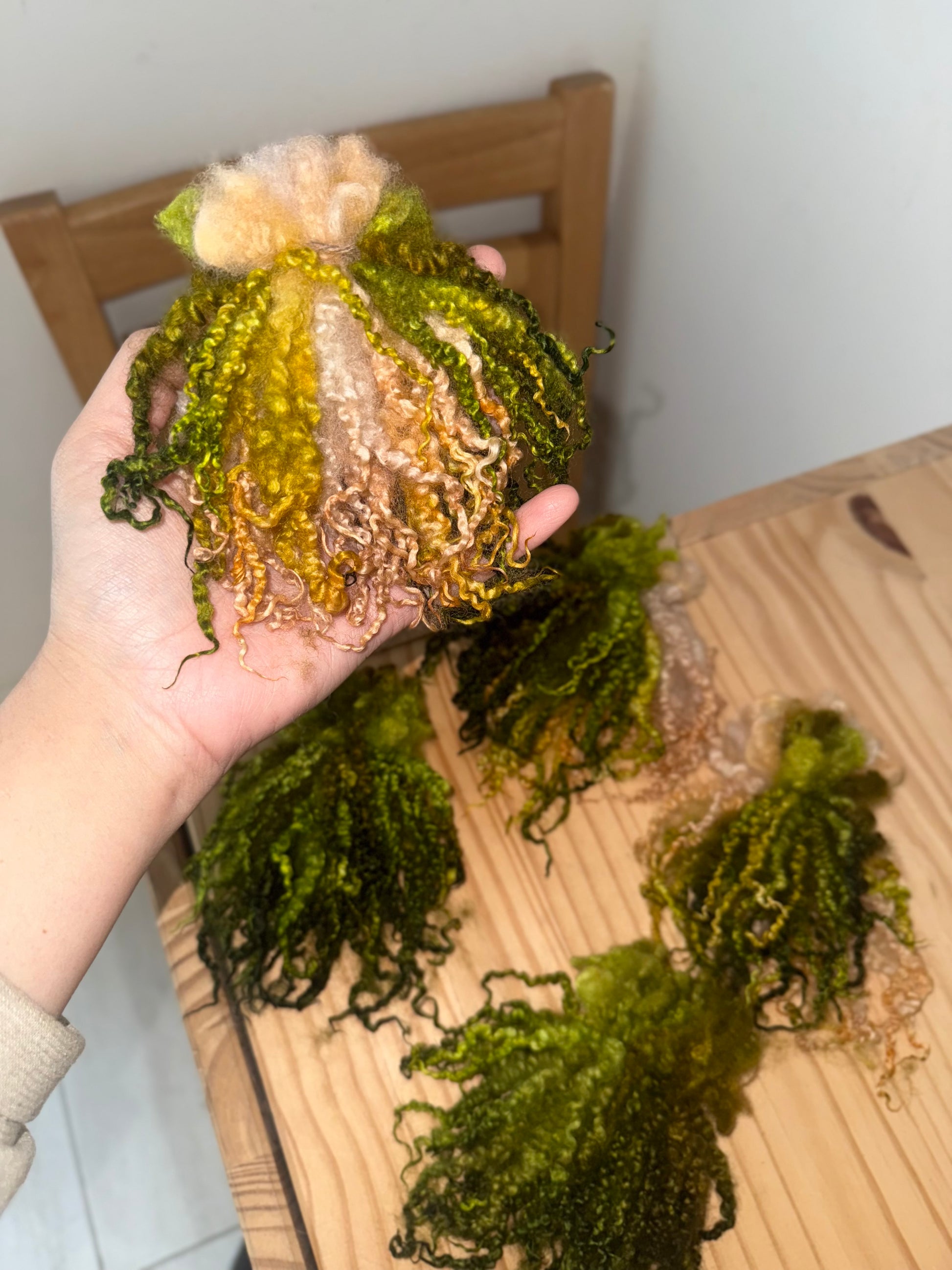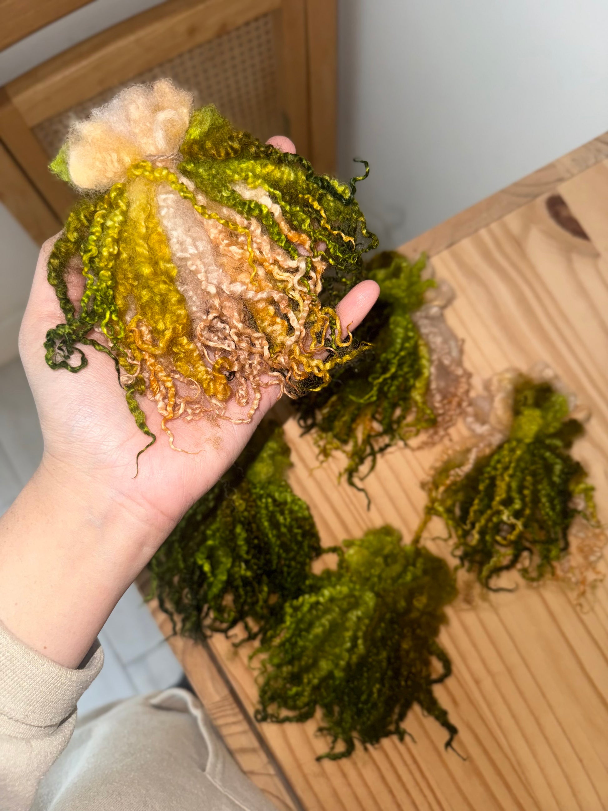 extra long BFL (bluefaced leicester) locks - these bundles are pre pulled individual locks and the length ranges from 5-7” unstretched. they’re super soft, teeny tiny curls that can be used for countless different crafts including spinning, carding, and felting.