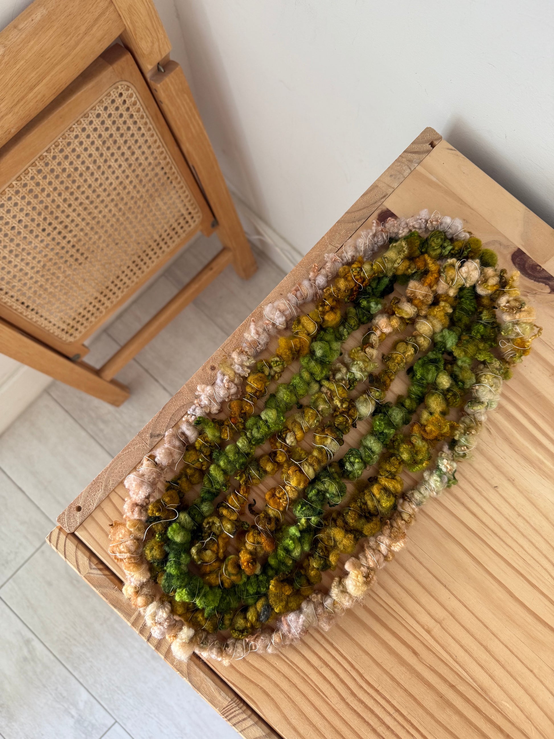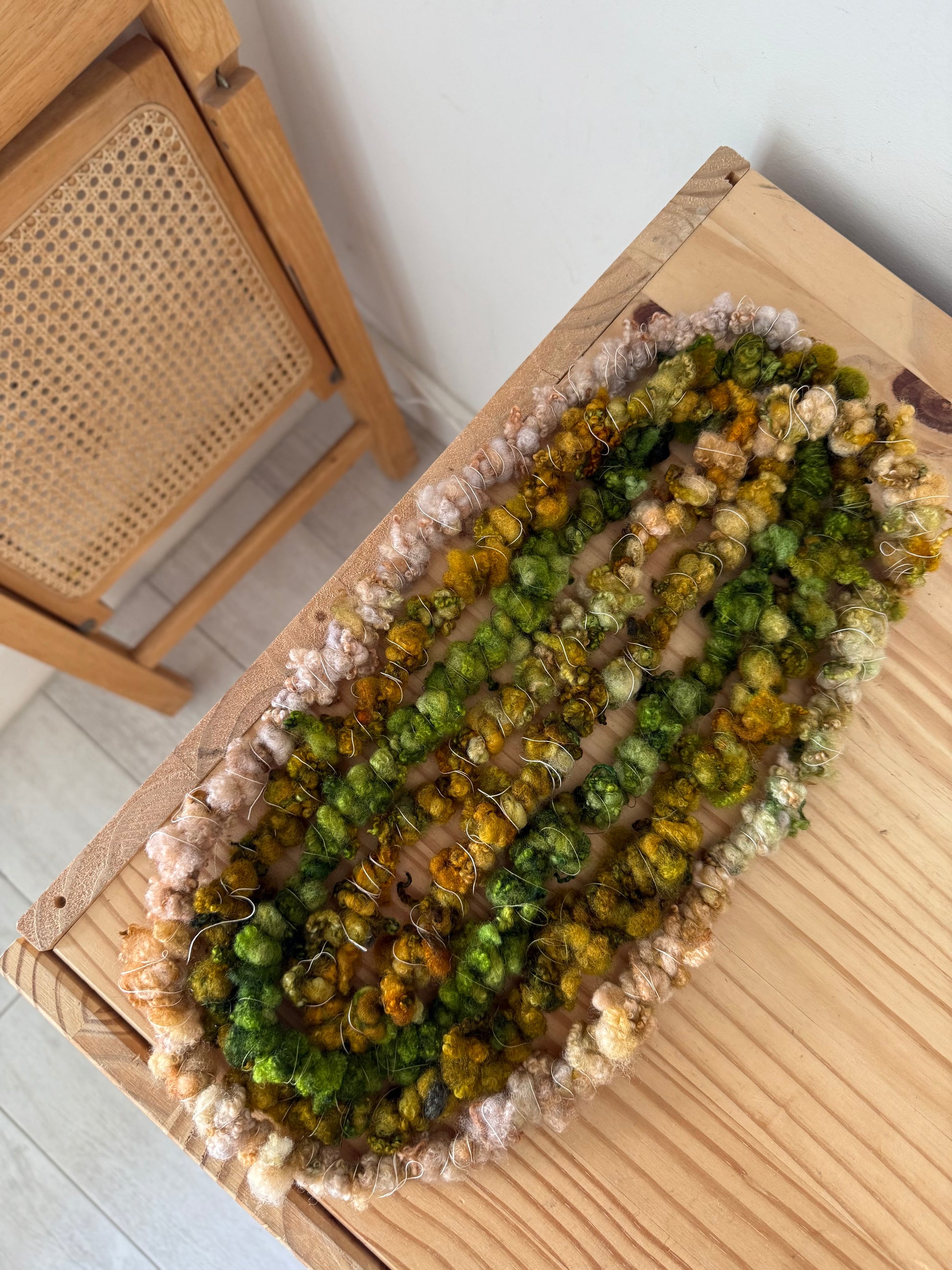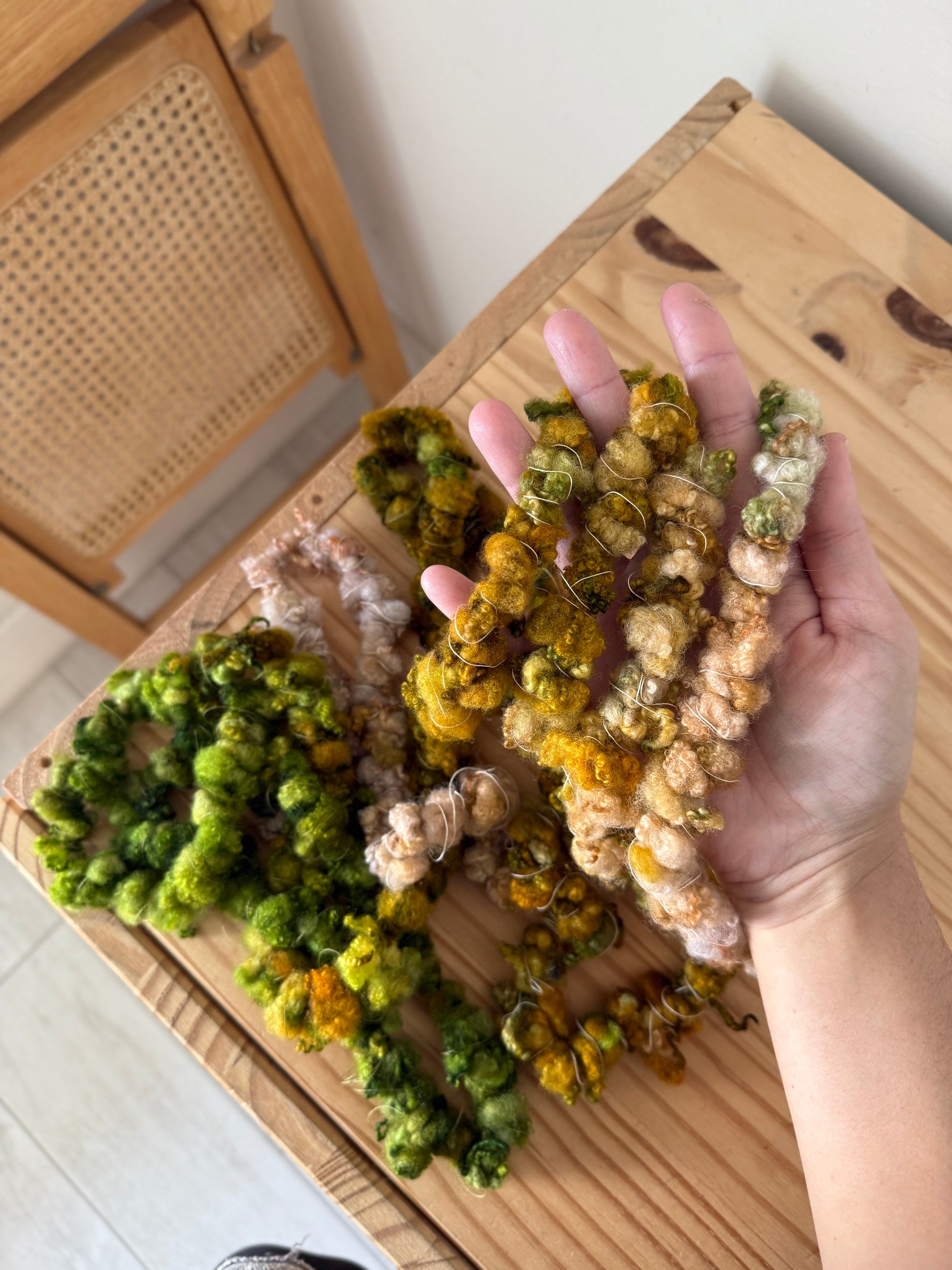 Some tips to keep in mind when using handspun yarn — make sure to be very gentle and careful with art yarn— some may have added fibers like scraps, silk, and thread that make them extra fragile. Most hand spun has a specific amount of twist in order to make them— do not pull on them— try not to change the direction of the twist when handling them, this can unwind them.