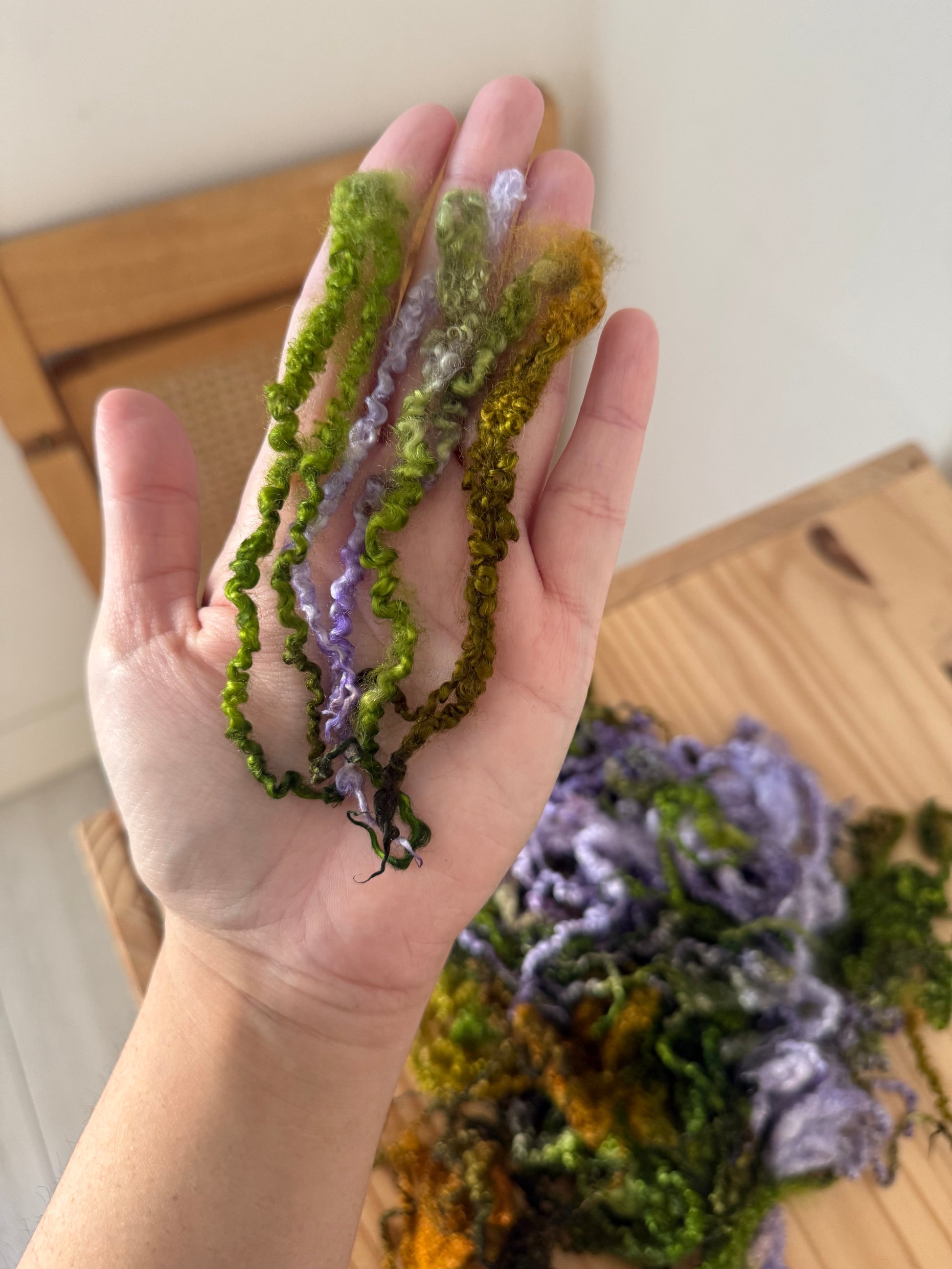 BFL (bluefaced leicester) locks - this fleece is made up of beautiful extra crimpy uniform locks. they’re easy to pull apart and use as individual strands with a staple length of 5-6”. these can be incorporated in countless different crafts and projects, get creative!