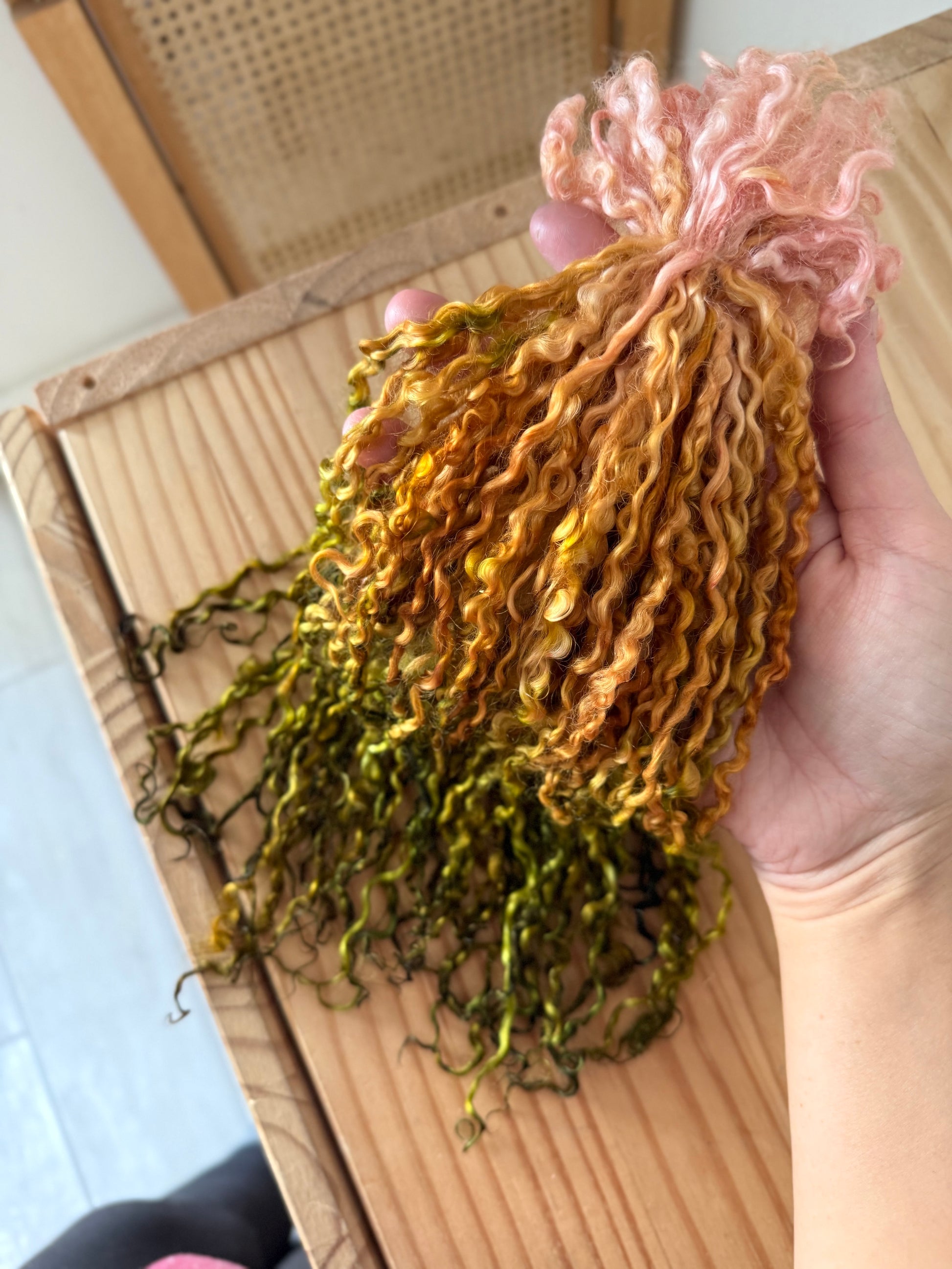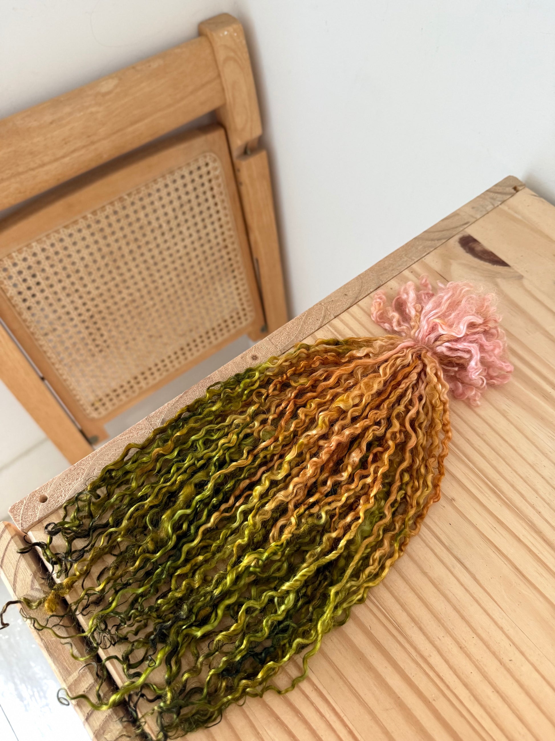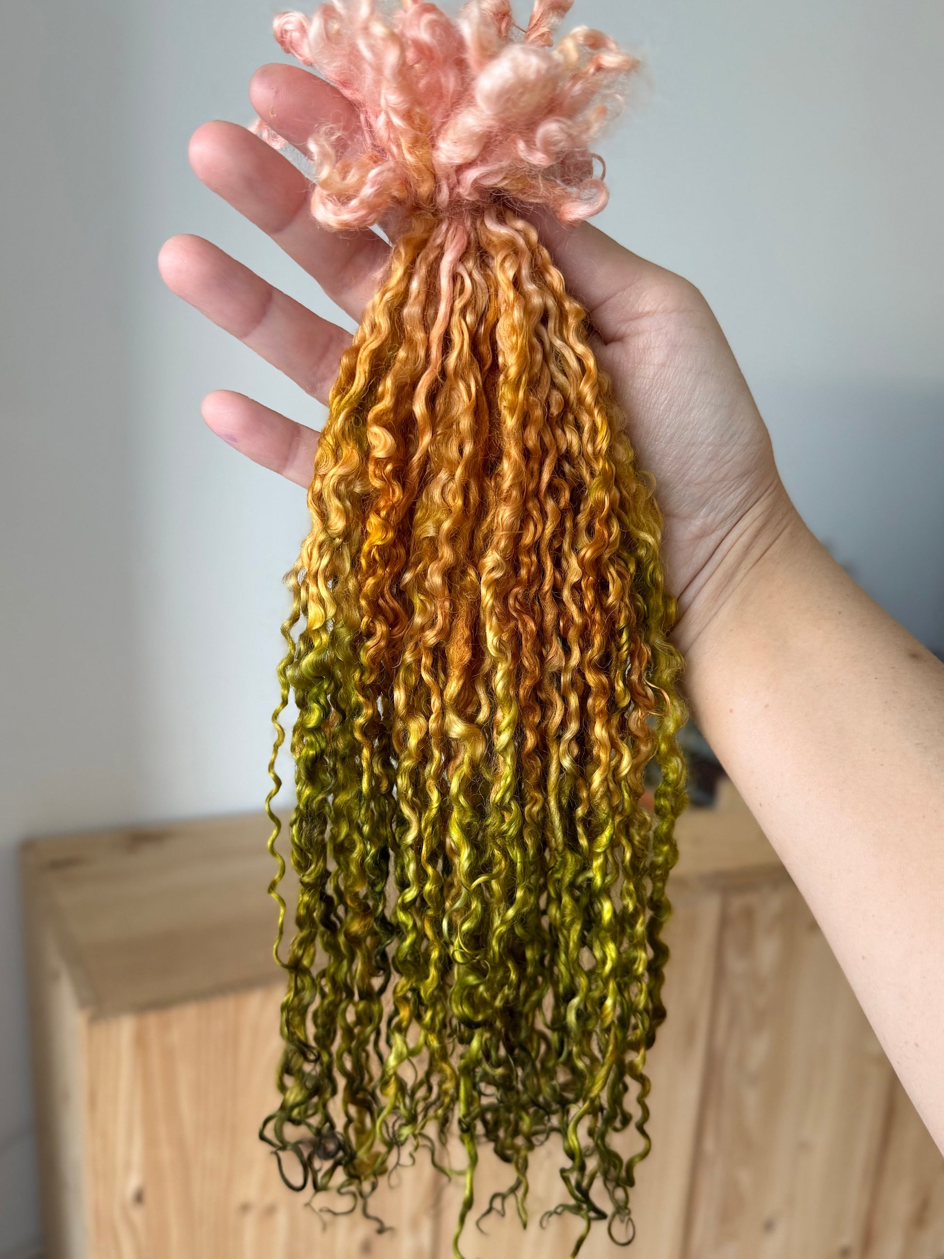 approximately 13”+ extra long hand-dyed wensleydale locks. These work great for a variety of fiber arts and crafts such as spinning, carding, and felting.
