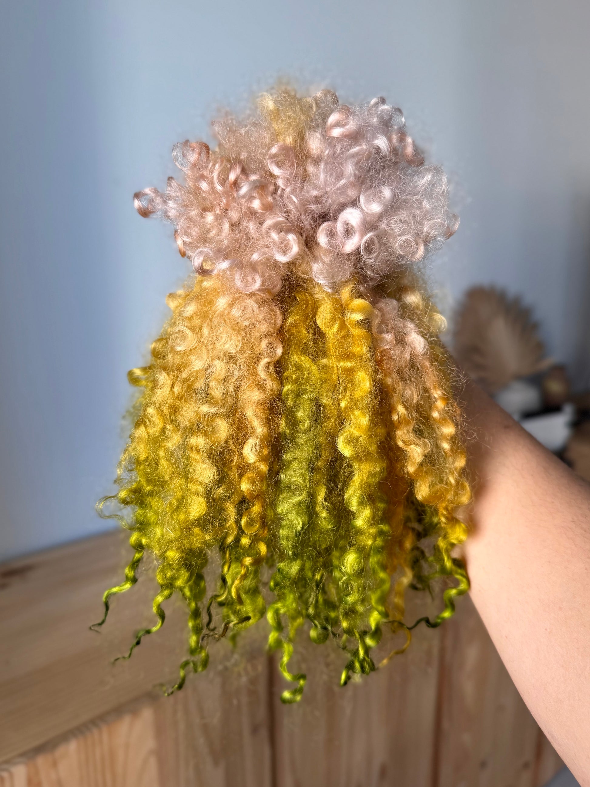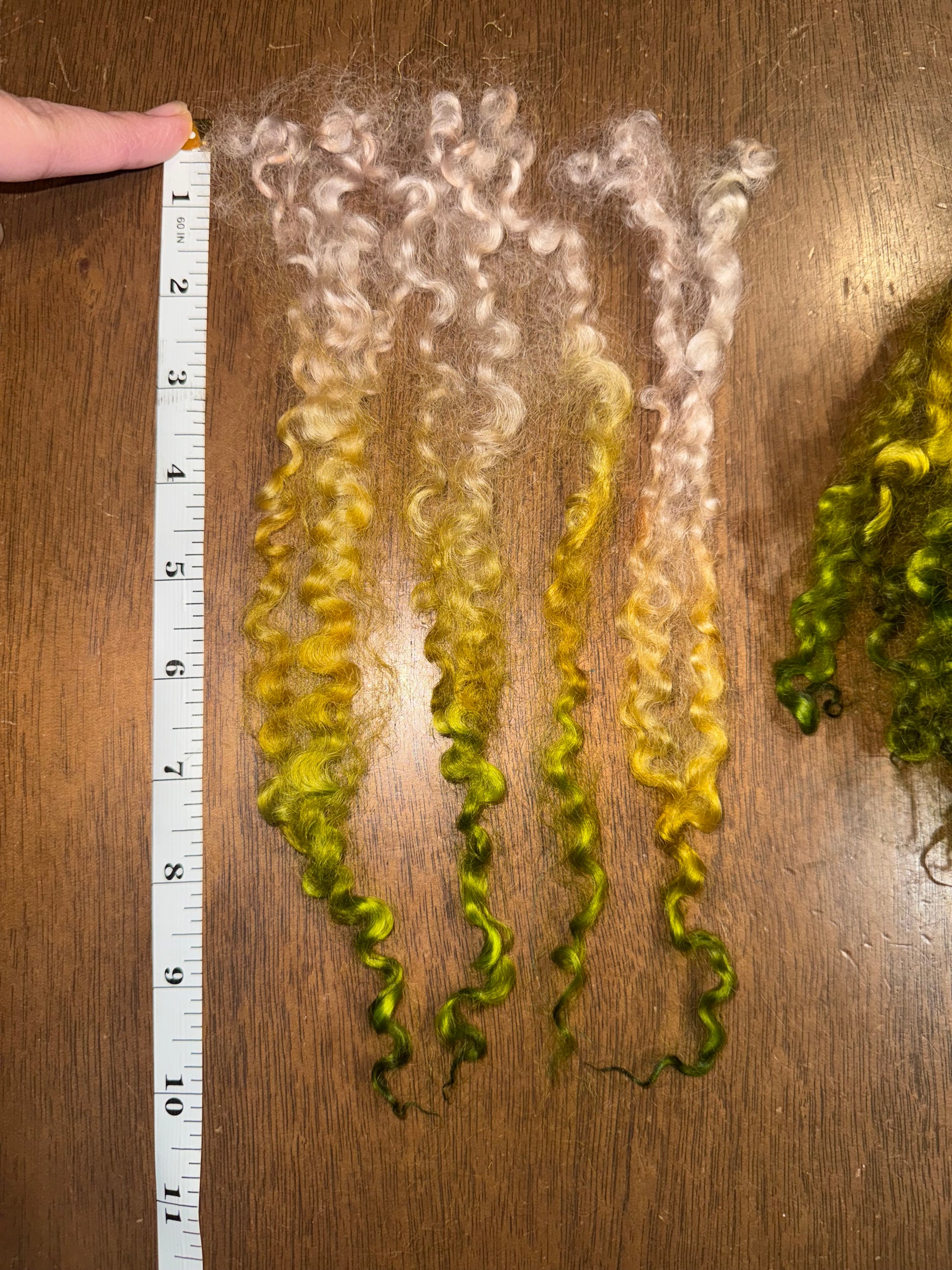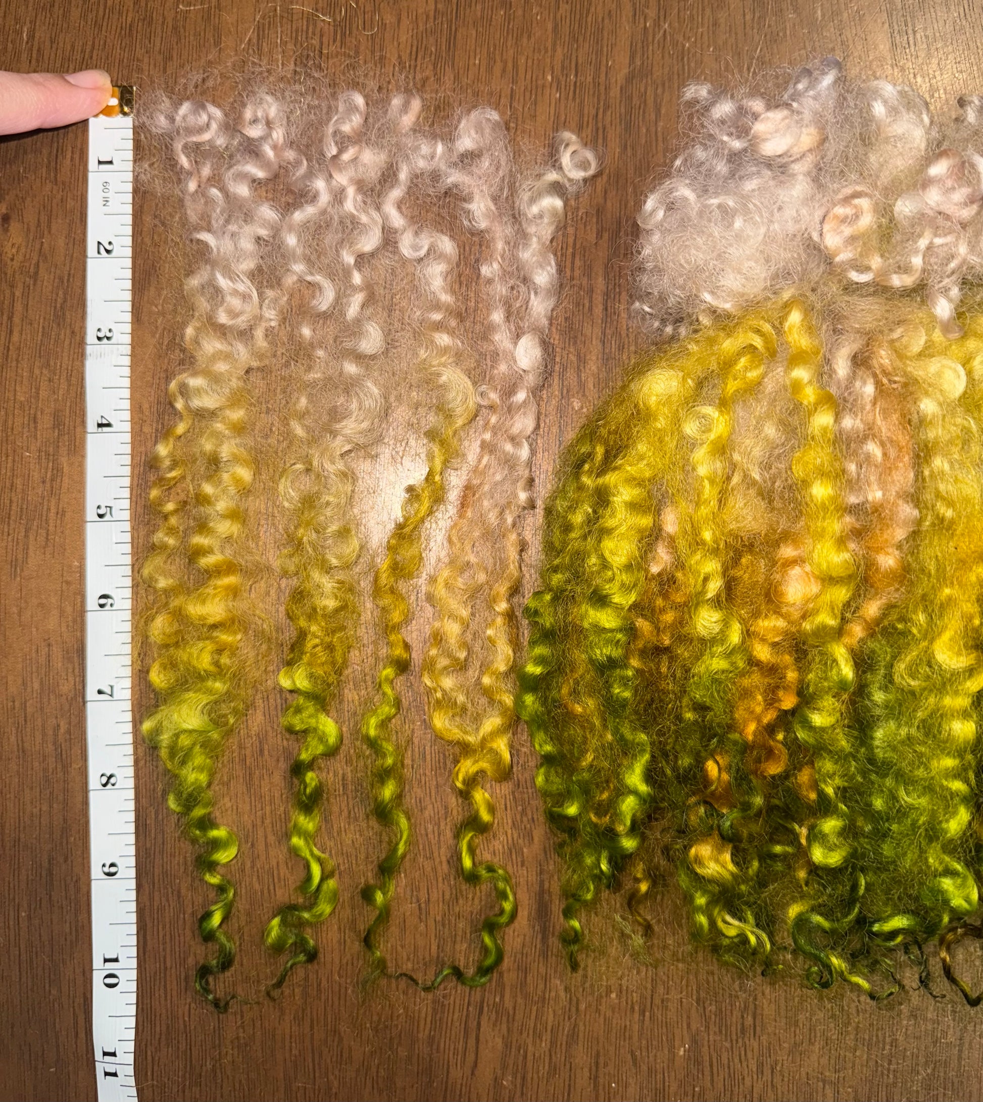 1 ounce of hand-dyed wensleydale locks that measure around 10” long. These work great for a variety of fiber arts and crafts such as spinning, carding, and felting.