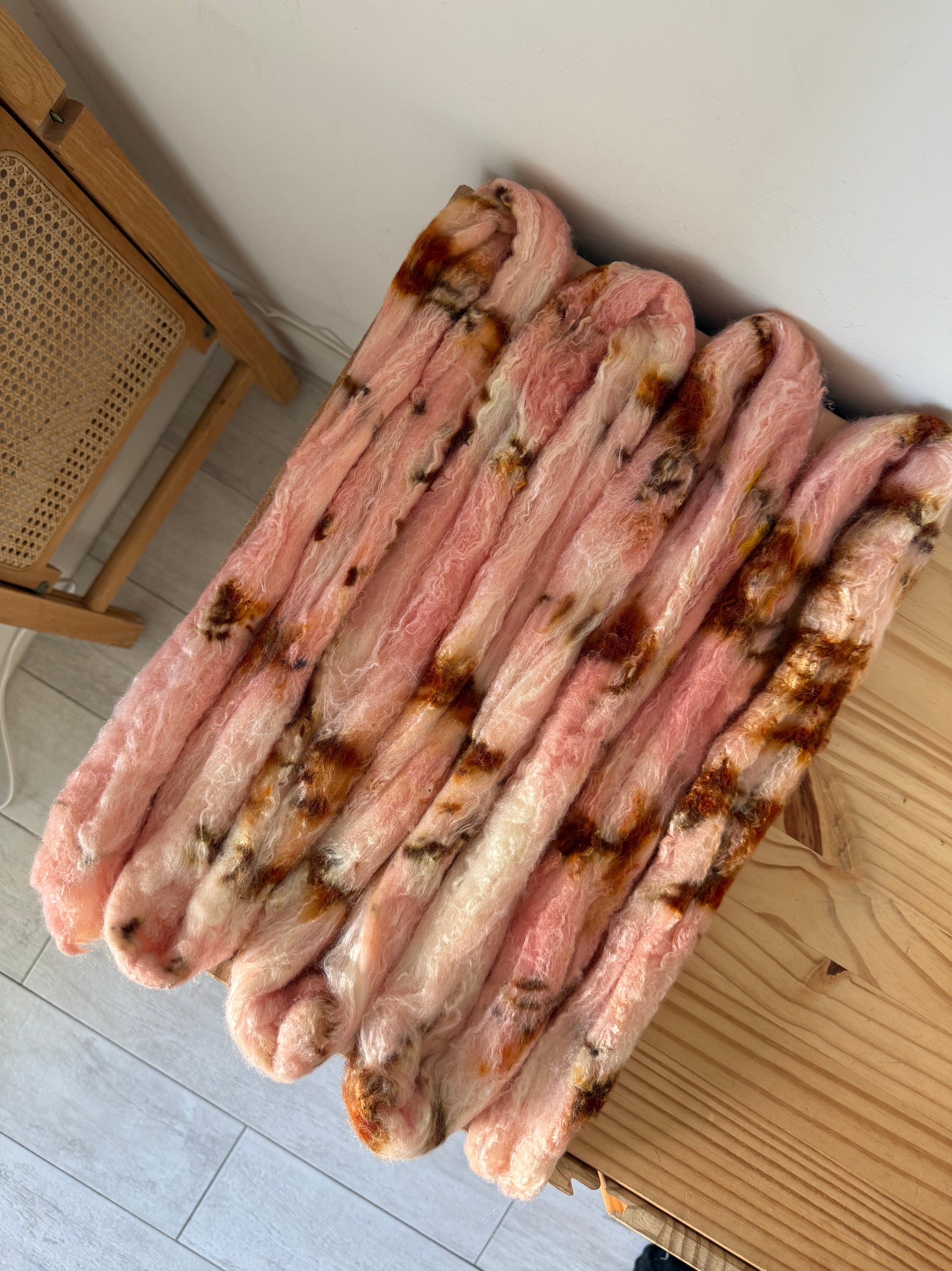 -there may be slight color bleeds when washed, especially with red and purple tones. these fibers have been fully exhausted with dye and rinsed to the best of my abilities.