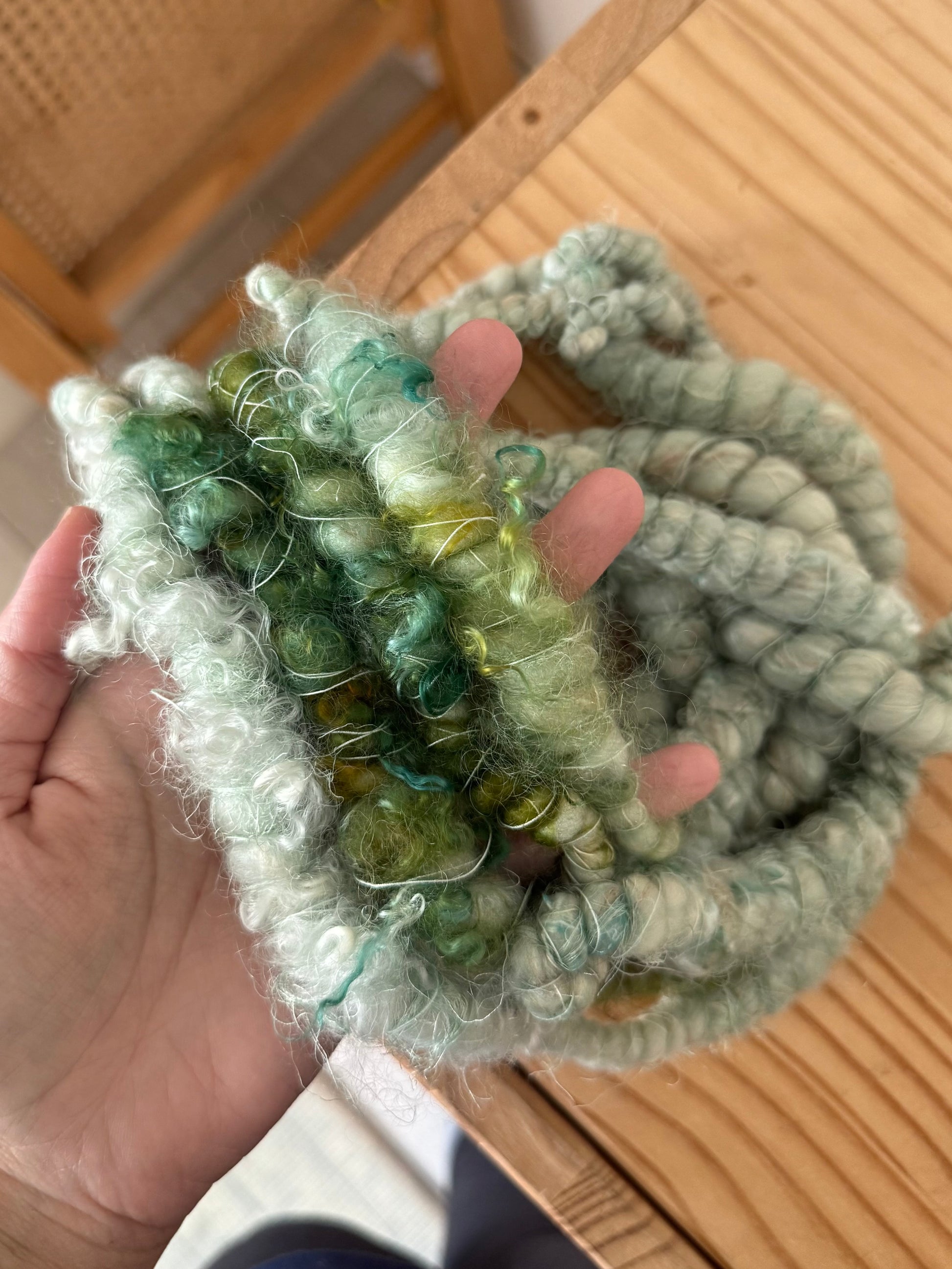 Some tips to keep in mind when using handspun yarn — make sure to be very gentle and careful with art yarn— some may have added fibers like scraps, silk, and thread that make them extra fragile. Most hand spun has a specific amount of twist in order to make them— do not pull on them— try not to change the direction of the twist when handling them, this can unwind them.