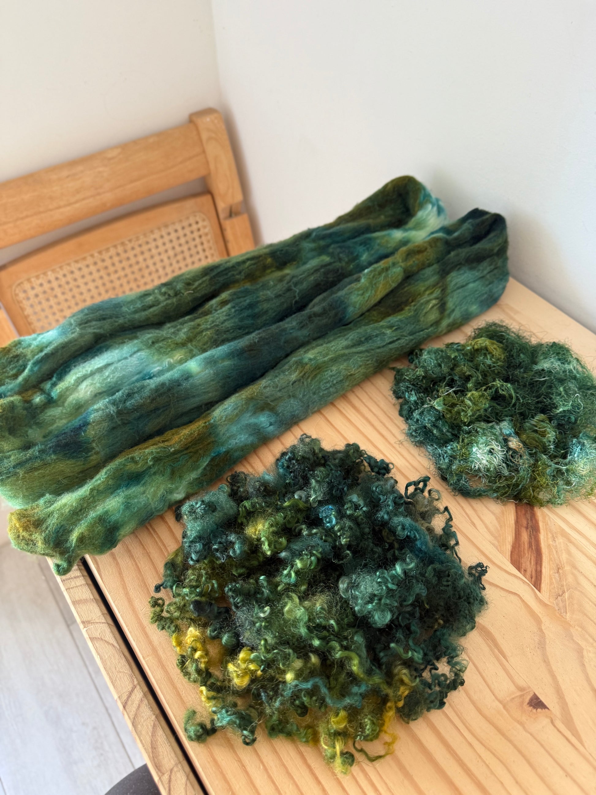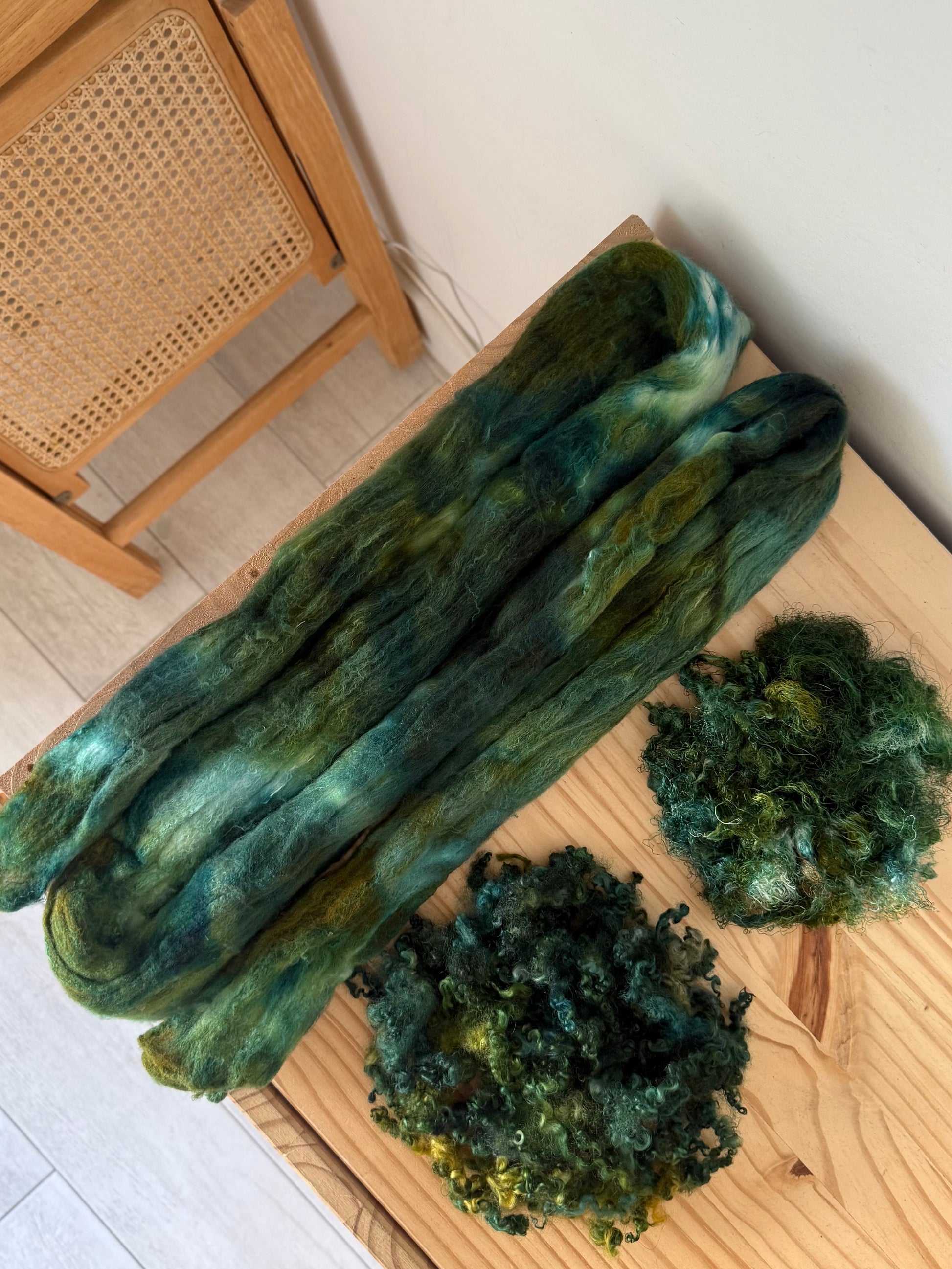 This spinning pack includes; A blend of rambouillet/silk wool, silk waste, and wensleydale locks that have been hand dyed to match together perfectly!