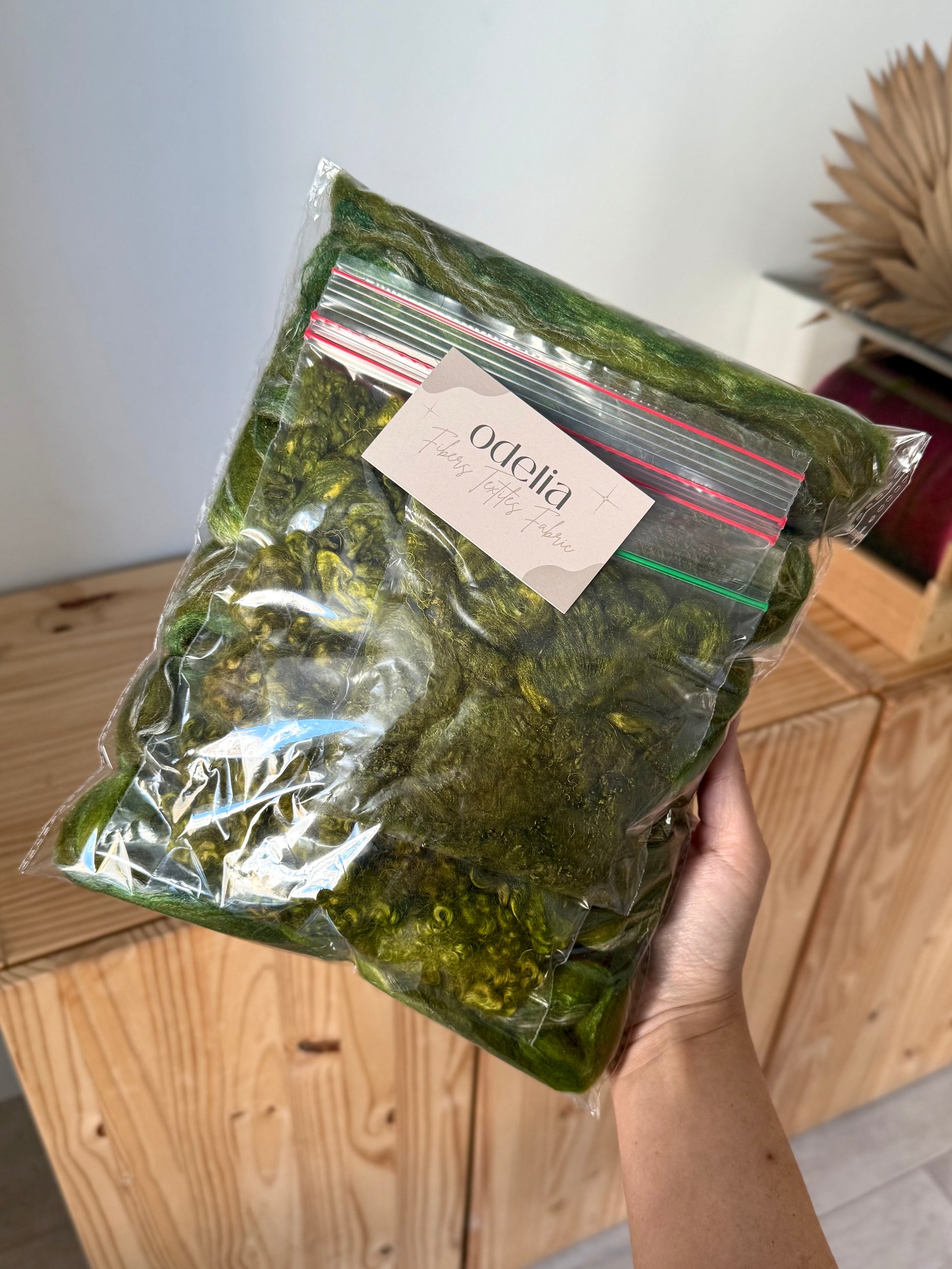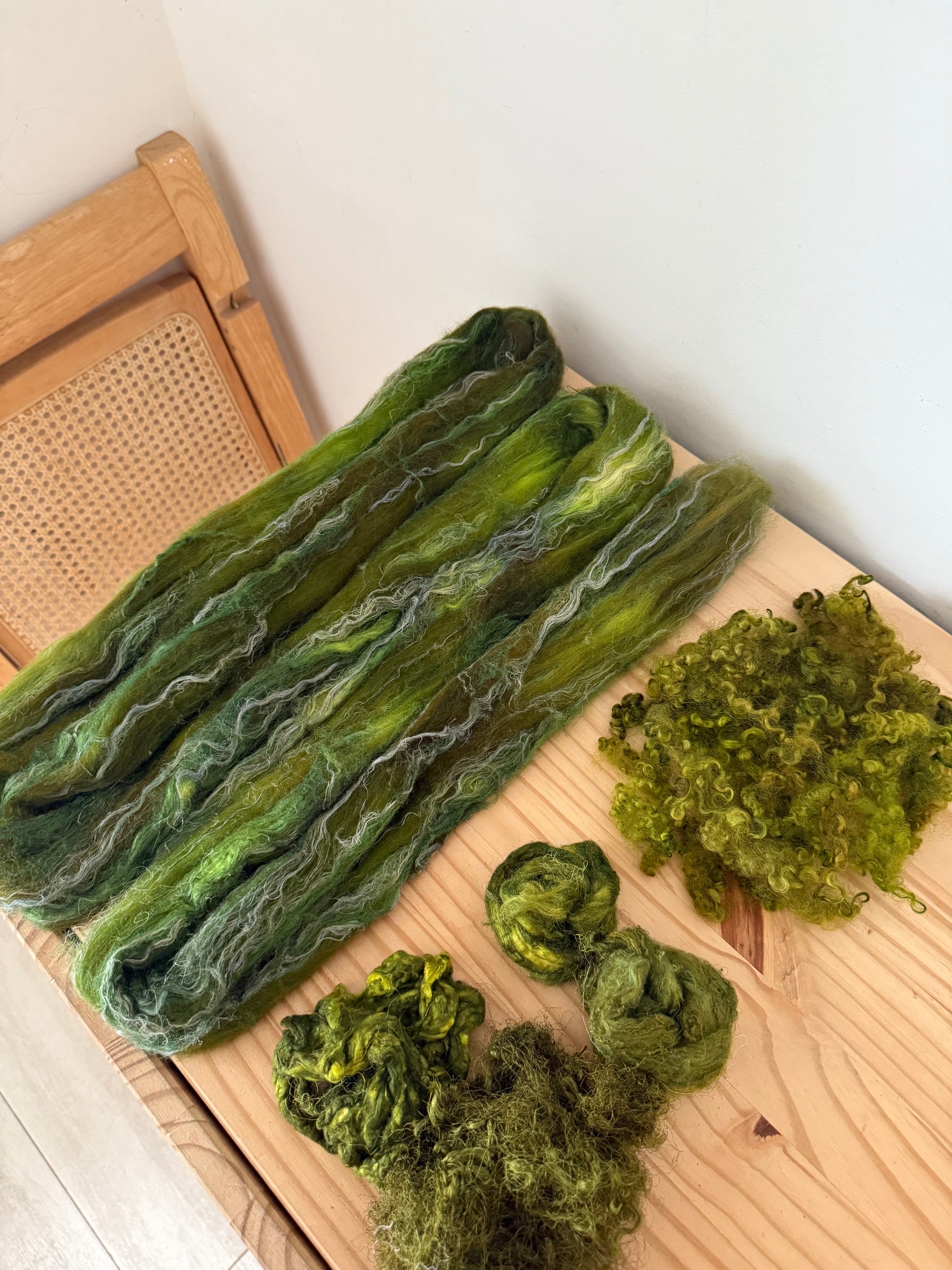 This spinning pack includes; A blend of merino/silk/flax wool, silk theads, silk noils, silk lap, tussah silk, and wensleydale locks that have been hand dyed to match together perfectly!