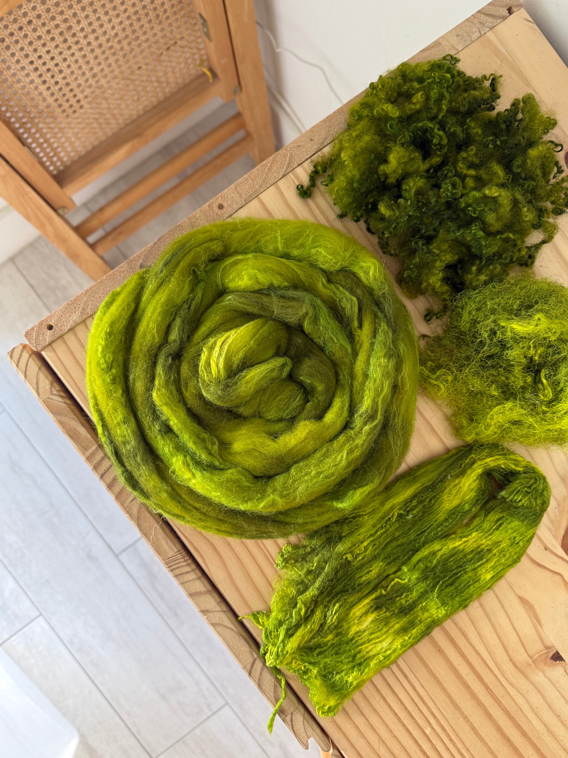 This spinning pack includes; merino/silk wool, silk lap, silk threads, and bfl locks that have been hand dyed to match together perfectly!