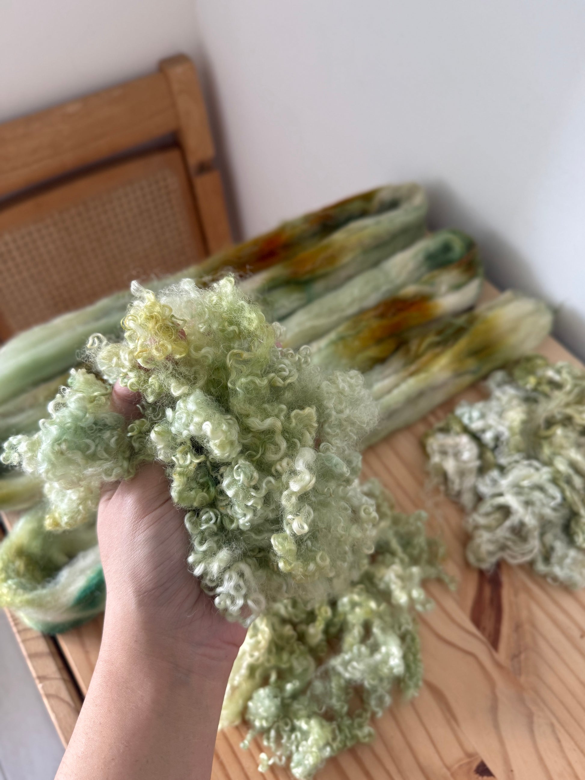 This spinning pack includes; merino/silk/flax wool, silk waste, and bfl cross locks that have been hand dyed to match together perfectly!